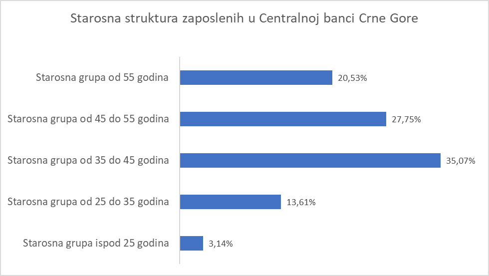 U Centralnoj banci, kao vrhovnoj monetarnoj instituciji sa izuzetno složenim i zahtjevnim nadležnostima i odgovornostima, na dan 31. decembra 2025. godine bilo je zaposleno 382 lica. Od ukupnog broja zaposlenih, 81,14% ima visoko obrazovanje. Među njima, 25,65% posjeduje akademski stepen magistra/mastera nauka, dok 2,87% ima zvanje doktora nauka.